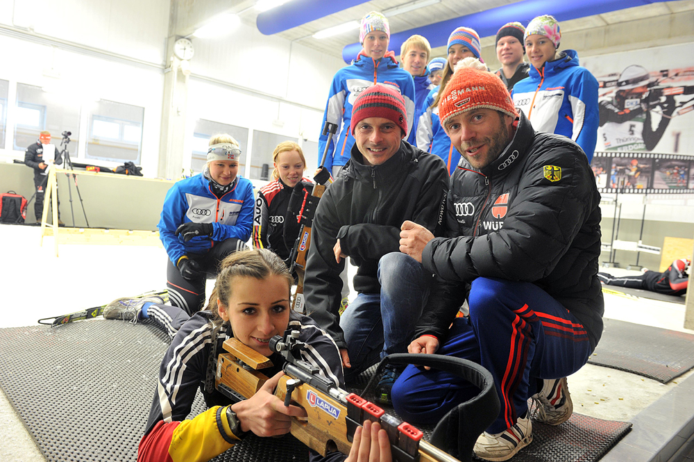 Der Suhler Physiotherapeut Uwe Leipold-Büttner feuert am 5. März beim Staffelrennen der deutschen Jugend- und Juniorenmeisterschaften Nachwuchsbiathletin Jessica Lange vom WSV Oberhof an... |